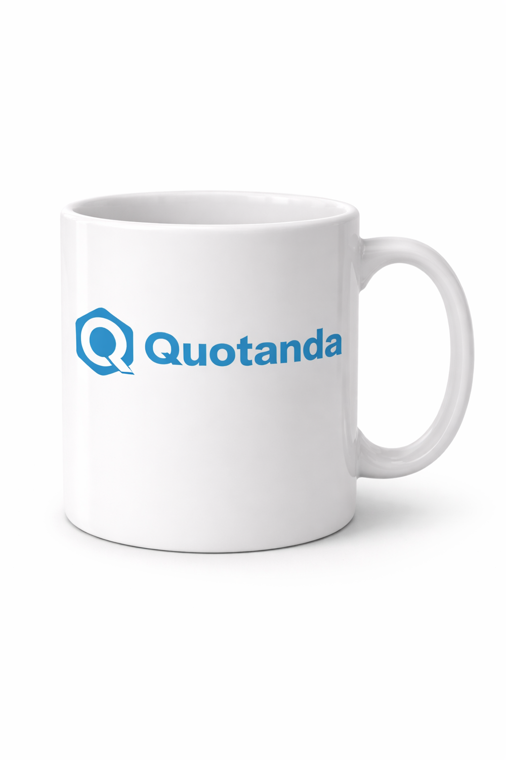 Taza de cerámica blanca con acabado brillante y el logotipo oficial de Quotanda impreso a todo color. Ideal para café o té, resistente al uso diario y apta para microondas y lavavajillas. Un básico corporativo elegante para oficina o regalo.